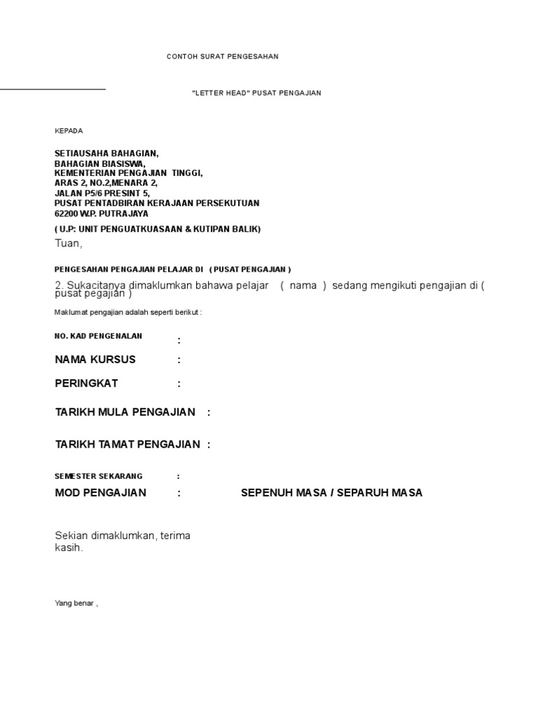 Letter head pusat pengajian pengajian. Siswa biasanya memerlukannya ketika akan mengajukan beasiswa atau mengikuti perlombaan dan pertukaran pelajar. Unit penguatkuasaan & kutipan balik) tuan, pengesahan pengajian pelajar di ( pusat pengajian ) 2. Sign, fax and printable from pc, ipad, tablet or mobile with pdffiller ✔ instantly. Jika anak anda baru saja lahir tentunya membutuhkan akte kelahiran.