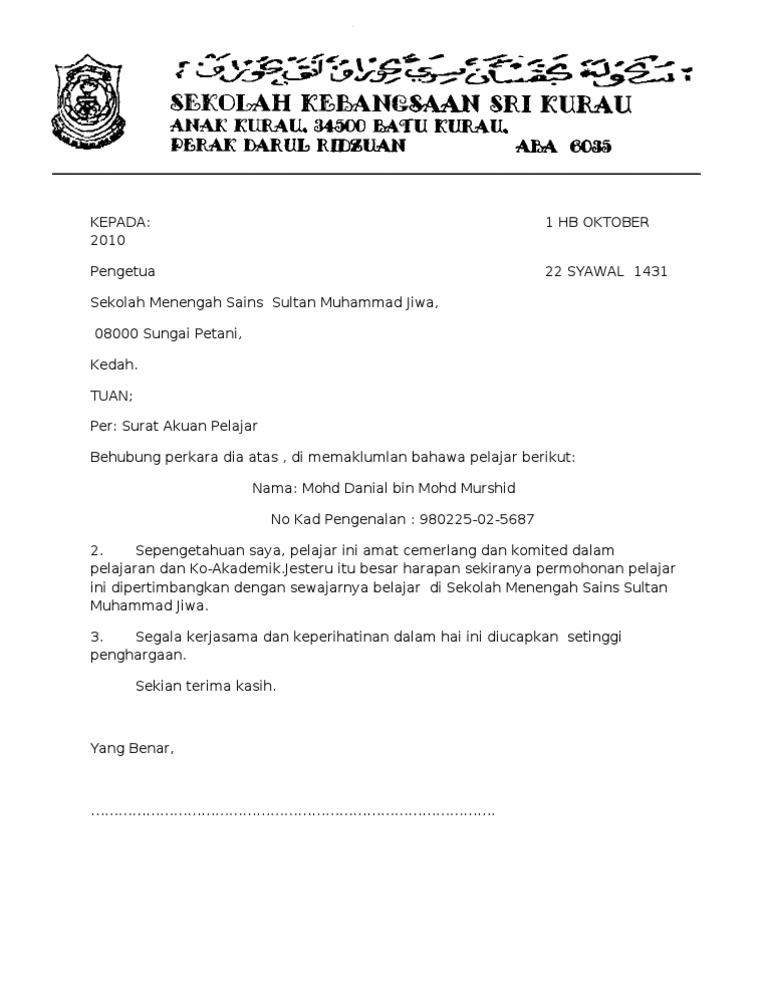 Contoh Surat Pengesahan Pelajar : Surat akuan pengesahan pendapatan ini adalah sebagai pengesahan pendapatan pemohon daripada daripada orang tertentu.. Contoh surat pengesahan pelajar universiti mp3 & mp4. Seia#a $erke%aa% tua%& surat pengesahan pelajar !e%'a% e'a(a horma)%*a #erkara +i a)a a+a(ah +irujuk. Agar surat terjamin keabsahannya, surat pengalaman kerja membutuhkan tanda tangan beberapa orang yang berwenang. +a(ah +iahka% baha,a nurul fatihah bt ibrahim meru#aka% beka #e(ajar sekolah kebangsaan sungai terah. Jadi, pemohon yang bekerja sendiri perlu menyatakan pendapatan mereka yang sebenar untuk mengisi sebarang permohonan.