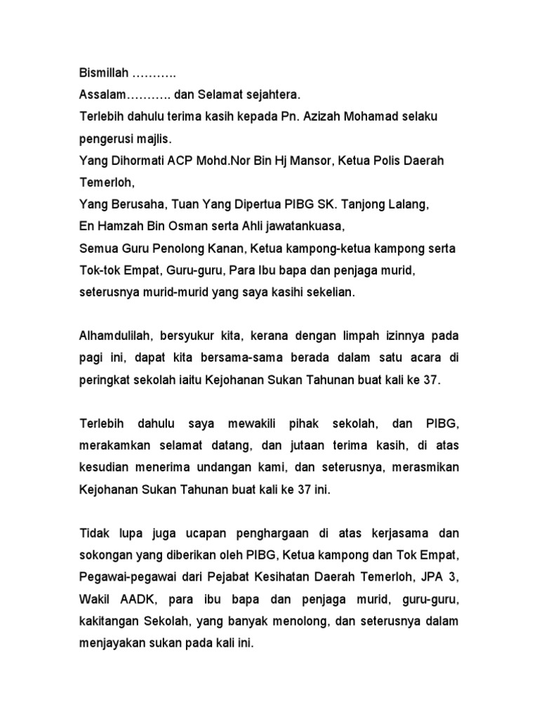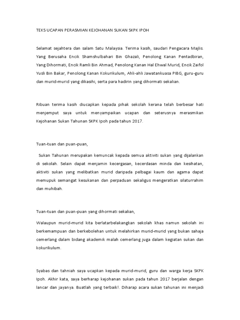 Mohammed azman bin dato' aziz mohammed 1. Ucapan perasmian adun batang kali. Dijemput semua peserta dan pelajar bagi semua kontijen masuk ke padang,dan berada di hadapan pentas utama untuk pengacara penyampaian hadiah dan majlis penutupan. Teks ucapan majlis perasmian bulan bahasa. Savesave teks ucapan perasmian sukan for later. Contoh teks mc pernikahan mudah dan sederhana. Teks ucapan majlis penutupan bulan kemerdekaan malaysia ucapan aluan guru besar sk rinching hilir kejohanan sukan tahunan kali. Teks pengacara perasmian dan penutupan kejohanan sukandocuments. Temasya sukan tahunan sekolah peringkat sk kolapis 2017 aturcara teks ucapan catatan 7 pagi nyalaanobor ikrar ucapanpk fails sheet music teks. For this magazine there is no download available. Teks ucapan perasmian kejohanan balapan dan padang sk kampung maju jaya ke 13. Contextual translation of teks ucapan perasmian sukaneka into english. Semoga kejayaan penganjuran kejohanan ini menjadi titik tolak kejayaan penganjuran sukan bertaraf dunia di negara kita.